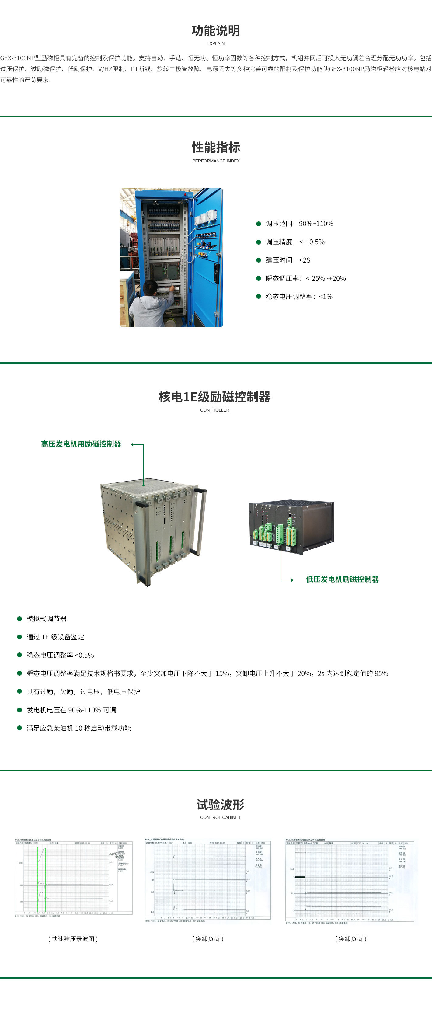 GEX-3100NP型勵(lì)磁柜是我公司為核電站應(yīng)急柴油發(fā)電機(jī)組設(shè)計(jì)的勵(lì)磁設(shè)備,該勵(lì)磁柜設(shè)計(jì)科學(xué)合理,可靠性高。工藝結(jié)構(gòu)設(shè)計(jì)、電磁兼容設(shè)計(jì)、冗余性設(shè)計(jì)、環(huán)境適應(yīng)性等均達(dá)到行業(yè)先進(jìn)水平。該型勵(lì)磁柜已通過(guò)核級(jí)鑒定并應(yīng)用于多個(gè)現(xiàn)場(chǎng)。